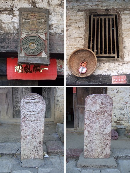 這間房子剛好在T字路口,也就是風水學上的“路沖”,雖然子不語怪力亂神,但自己的住家還是多少相信一些啦。您看這戶人家準備的多齊全:山海鎮、八卦、鏡子、剪刀、石敢當樣樣沒少,可能真的沖很大的樣子!