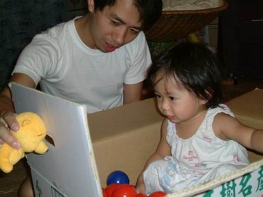 媽媽洗澡的時候,聽到爸爸講故事拉拉ㄍ一ㄍ一ㄍㄚㄍㄚ笑的聲音,洗好澡出來發現爸爸原來用拉拉的布偶演起『布袋戲』了。