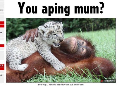 有期限的母子情 美國「莫特爾濱海野生動物園」(Myrtle Beach Safari),紅毛猩猩成為兩隻小白獅...