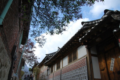 三清洞的建築物都很有特色,從三清洞地標前的旅遊諮詢中心,再往上走約50m,式各非常美麗的景點! 紅色建築和盛開...