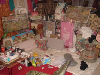 精彩的來了∼我和bebe凌亂的客廳∼客廳的另一頭,是衣櫃和客廳桌子客廳的另一面是倉庫 專門吊穿過的衣服和褲子還有一堆有的沒的阿罵的東西堆放 倉庫的另一面 真的很恐...