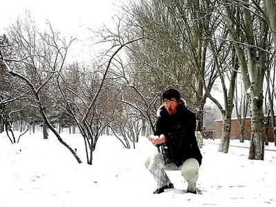 雪持續到中午,第二次與雪接觸叫逛雪。我們到更遠的森林去追雪,森林非常的廣大,所有的樹都光著身子,有些還禿頭,樹友們都變苗條了。地上則是舖著白地毯連綿無際,我在雪地裏邀請赤裸的樹合影;又跑到偏僻處與那石獅合影;也與破瓦殘屋合影。在淒涼的雪地裏,只能邀請這些殘燭年華者合影。