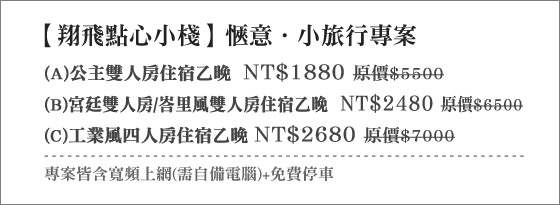 商品訊息簡述: 只要1880元起即可享【翔飛點心小棧】原價最高7000元愜意.小旅行專案:(A)公主雙人房住宿乙晚/(B)宮廷雙人房/峇里風雙人房住宿乙晚/(C)工業風奶H房住宿乙晚,專案皆含寬頻上網(需自備電腦)+免費停車。