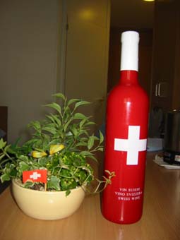 後來我們走了很久的路,到了一個玫瑰公園,也沒多少玫瑰,但因為天氣實在太熱,又加上走了很多路,也餓了,就到一家在半山腰的餐廳,想不到還真貴,於是我們就假裝一人點一個冰淇淋(也要fr.10)後來發現他們有賣一種紅酒dole,上面是瑞士國旗的圖案,顏色很美,很想買一瓶回去收藏,本來想說可能可以在別家店買到,後來店員強力說服我們,後來我們三個就各買了一瓶....真是愚笨的觀光客....