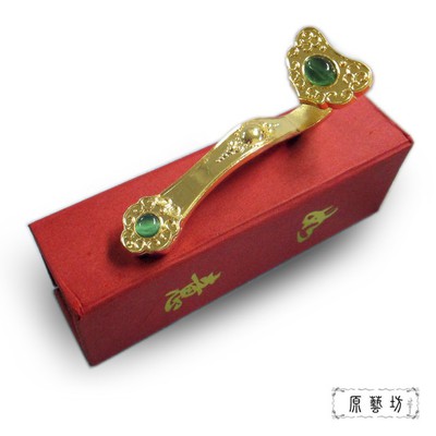 熱銷推薦~【原藝坊】銅鎏金巧雕 招正財綠貓眼金如意擺飾(長95mm)