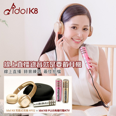 產品特點- idol K8 Plus 專屬配對耳機HF02,練歌錄音直播最速配- 9mm電容式麥頭,全指向收音,演唱更輕鬆- 迴音混響效果,高低音強化- 高品質混音晶片,聲音保真,音頻更細緻- 40mm HiFi 高傳真喇叭驅動單體- 沉穩低音清晰中高音 響應頻率10Hz-20000Hz- 改良式舒適透氣耳罩 緊密貼合隔噪- 可調式柔軟頭戴 輕量超吸睛設計 - 90°旋轉及可摺疊式設計 收納攜帶便利- 連接3.5mm耳機孔之手機/平板/筆電/桌機