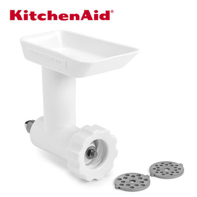 KitchenAid攪碎器,透過附件接口,與攪拌機結合,可輕鬆磨攪食材,配備粗細兩種磨盤,粗的磨盤適合做絞肉,細的磨盤適合精磨硬質堅果、乳酪類。