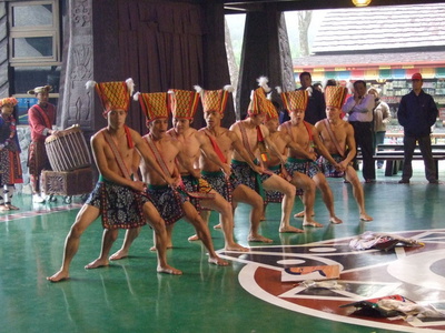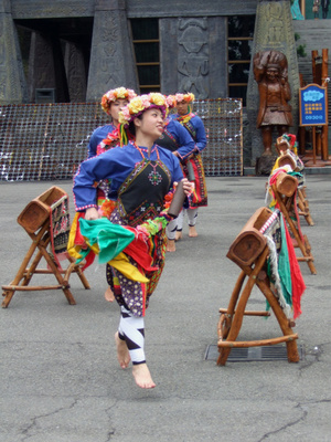 從龜速爬行的遊園公車下來,略過不吸引我的「觀山樓」,漫無目的往下走,經過「印第安圖騰區」時就遠遠地拍了幾張照片,這時耳邊又傳來原住民的音樂,循著樂聲來處走去,發現又是另一場在「娜魯灣劇場」的歌舞表演劇...