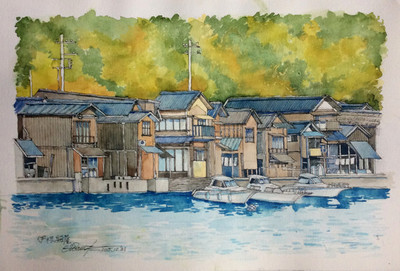 【伊根船屋】旅行記憶 / 針筆.淡彩 / 26 x 38 cm / 2015.12.31