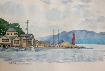 【紅色燈塔】伊根船屋旅行記憶 / 針筆.淡彩 / 26 x 38 cm / 2016.01.02