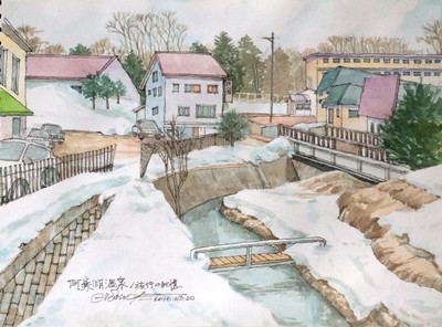 【笹井 HOTEL 附近的雪地】十勝川溫泉.旅行記憶 / 針筆.淡彩 / 19 x 26 cm / 2016....