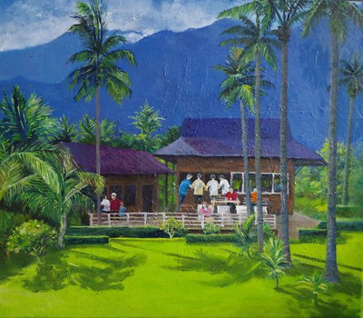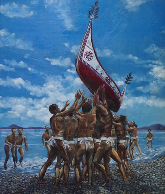 【船祭】/ 油彩‧畫布 / 10F / 2013‧7‧16 / 蘭嶼‧海沙屋民宿 收藏達悟族原住民出海捕魚的「...