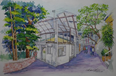 【蝴蝶館】/ 針筆淡彩 / 38.2 x 26.6 cm / 2013‧03‧17拖到4月6日才用針筆勾勒完成...