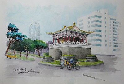 【台北小南門】/ 針筆淡彩 / 26.6 x 38.2 cm / 2012‧04‧01 / Adam配合台北市...
