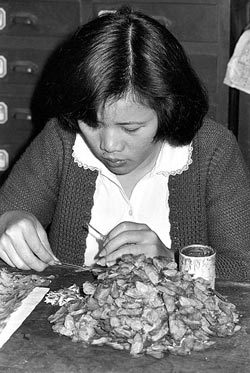 今與昔▲早年埔里婦女製作蝴蝶標本。(本報資料照片)