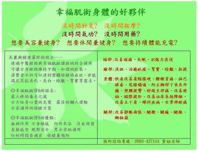 很多的美體操做者常為了體力上考量而選擇放棄了這個市場,但美體又是在美容的市場中佔有很大的商機, 也因如此我們一直在幫操做者找尋一個不傷身又能真正幫助消費者解決困擾的方法, 終於我們辦到了歡迎來深入的了解哦!! 『行動美容創業輔導』『店家合作聯盟』『新娘秘書』歡迎洽詢幸福專線0980-437114
