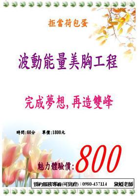 波動能量美胸工程.JPG妳能想像真的不用花大錢去做ㄍㄚˇ奶就能讓罩杯升級?活化疏通自體的細胞及乳腺,讓她自己UP UP~好過放一個假的東東在身上,危險又傷身~運用特調精油的能量,及特殊的手法,不但能改...