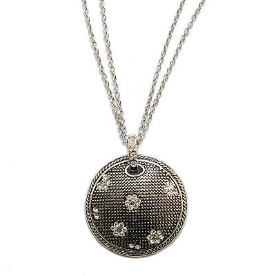【雨揚】「圓滿意」項鍊 「圓滿意」妝點頸項間自在優雅,是女人美麗的象徵。 「圓滿意」項鍊在仿古銀的圓盤上鑲嵌璀璨的晶鑽花朵,浪漫柔美的花朵像繁星閃爍,妝點頸項間自在優雅,是女人美麗的象徵,時光之翼攻略。命理中「圓」寓意「圓滿」,代表生活「圓滿如意」,經常佩戴圓形飾品,能轉變意念,消除對立,讓愛情婚姻圓滿,人緣指數提升,擁抱美滿人生。