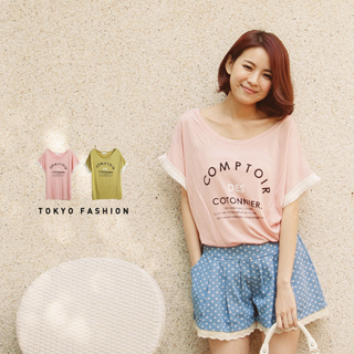 【東京著衣】花邊袖字母寬領T恤(日系)