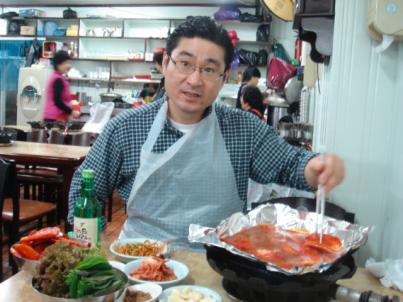 這是我最愛的韓國菜之一 伍花燒肉!!! 真的是看了眼就想吃 這一位主廚師 就是我的韓國好朋友之一 由於五花肉油多 因此吃這一道菜的時候 必須穿上圍多多 綠色那一瓶是必備的韓...