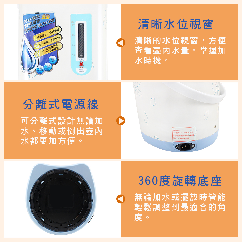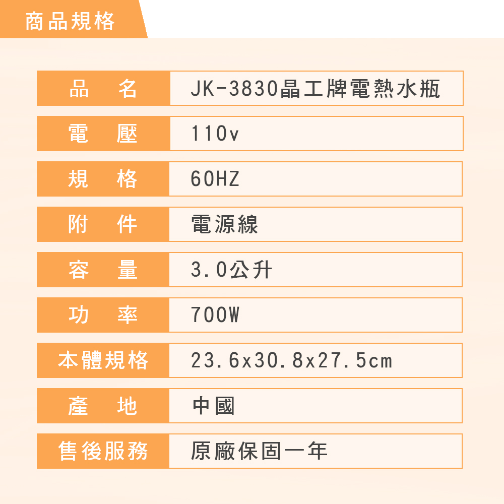 【晶工牌】3.0L電動熱水瓶 JK-3830 的產品介紹在下面,