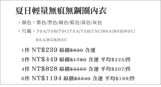 商品訊息簡述: 平均每件最低只要199元起(含運)即可購得夏日輕量無痕無鋼圈內衣1件/2件/4件/6件,顏色:紫色/黑色/膚色/藍色/黃色/灰色,尺碼:70A/70B/70C/75A/75B/75C/80A/80B/80C/85A/85B/85C。