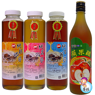 ◆商品組合: 純龍眼蜜820g/瓶x1 + 純荔枝蜜820gx1 + 純百花蜜820gx1 + 蘋果醋600ml x1