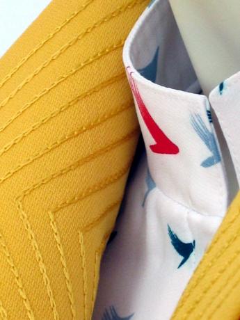 整體的設計是高尚的立領外套 搭配華貴的黃色翻領, 並由金色繡線點綴~