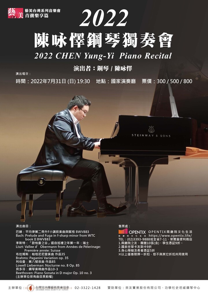 2022年,鋼琴家陳咏懌帶來作曲家巴赫、李斯特、布拉姆斯、利伯曼與貝多芬之作品,從巴洛克時期到浪漫時期再橫跨到現代,有賦格、變奏曲及夜曲等,盡是不同風格的曲目,充份表現出演奏家精湛的技巧。鋼琴家陳咏懌用音樂串起時光迴廊,帶領聽眾透過88個琴鍵閱讀他的心路歷程及豐碩成果!
