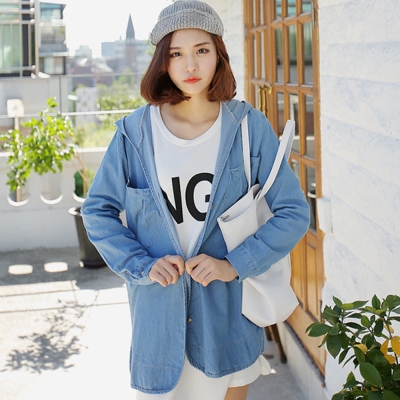 [夏日穿搭]兩側釦造型口袋連帽牛仔長襯衫(藍) Listolife正韓穿搭技巧教學!
