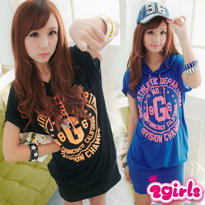 最新分享【2girls】螢光配色膠印字母連帽洋裝 (共二色)