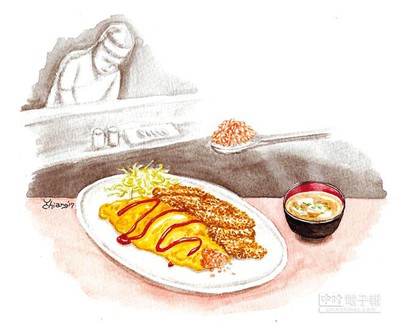 我每次都外帶豬排蛋包飯,站在櫃台前,入迷的看著師傅料理,雖然蛋包飯是常見的料理,但師傅卻十分仔細,用刀背輕敲肉排,撒上細鹽,鋪上乳酪,細細的裹上麵粉,下鍋,接著取出梅子剁碎,拌在飯裡,倒在平底鍋中的煎蛋上,這時老闆娘會過來接手,將蛋飯翻面成形,師傅則專注的看著油鍋中的豬排,在最金黃色澤的時候取出,就成為我當時每日最期盼的晚餐。