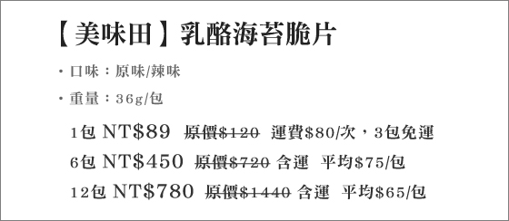 商品訊息簡述: 平均每包最低只要65元起(3包免運)即可購得【美味田】乳酪海苔脆片:1包/6包/12包(36g/包),口味選擇:原味/辣味。