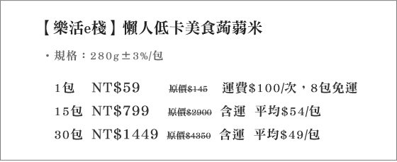 ●每包蒟蒻米熱量不到18大卡,輕鬆控制熱量攝取,清爽順口!