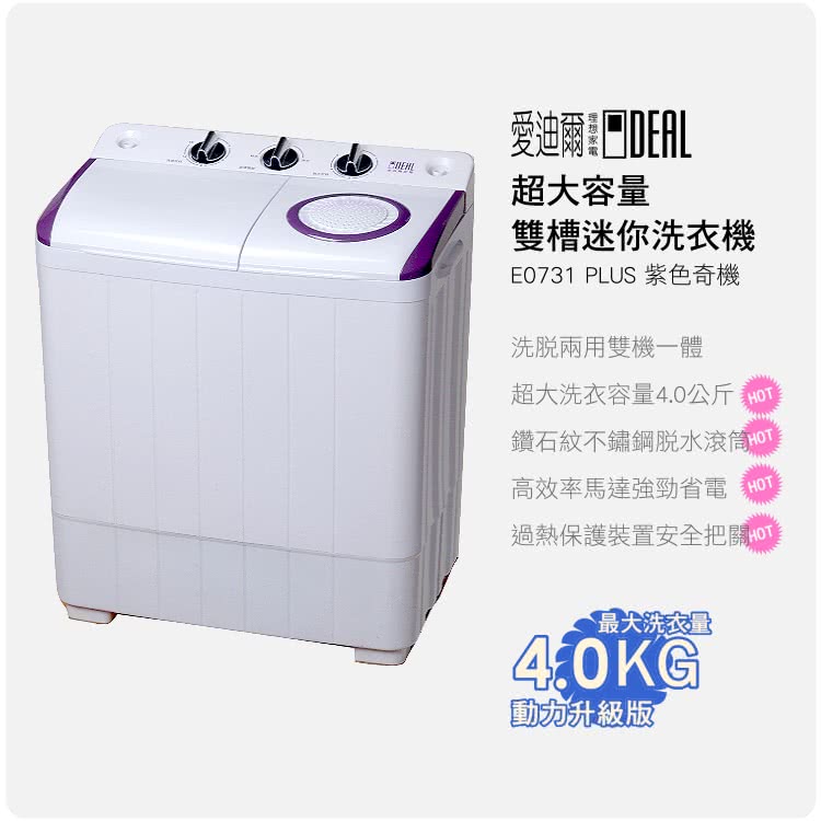 【IDEAL 愛迪爾】4kg 超大容量 洗脫兩用 雙槽迷你洗衣機(紫色奇機 E0731 Plus 限量促銷) 討論,推薦,開箱,CP值,熱賣,團購,便宜,優惠購買刷卡折扣,介紹,排行,精選,特價,周年慶,體驗,限時