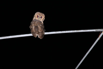 繞了大半圈回到四人房宿舍旁,終於可以出聲說話了,阿雄開玩笑說山豬一定正在嘲笑我們吧!一邊說著,一邊走在往丙棟宿舍的路上,忽然有一大型鳥類展翅飛過我們頭頂,大家無聲大嚷:灰林梟!阿雄立即搶過阿雅手上已經點亮的頭燈,照向牠飛去的方向,沒想到牠就停在簡易溫室的鐵架上,讓蜀龍拍到了幾張精彩的照片。這就是今晚最大的收穫了。至於梅峰山豬搜索隊何時將再出發呢?就看大家哪天傍晚還想一起出去散步吧!120904
