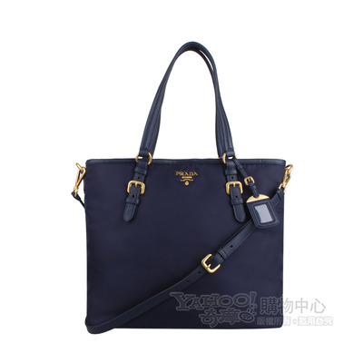 PRADA 金字浮雕LOGO尼龍皮革飾邊肩背/斜背兩用購物包(深藍)