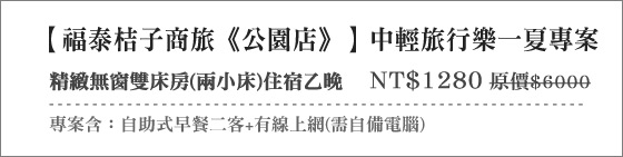 商品訊息簡述: 只要1280元(雙人價)即可享【福泰桔子商旅《公園店》】原價6000元台中輕旅行樂一夏專案:精緻無窗雙床房(兩小床)住宿乙晚+自助式早餐二客+有線上網(需自備電腦)。
