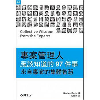 詳細資料ISBN:9789862766378 規格:平裝 / 248頁 / 15.5 X 23 CM / 普通級/ 單色印刷 / 初版 出版地:台灣 內容簡介 如果管理的專案不如預想般順利進行,《專案管理人應該知道的97件事》將能為你提供無價的知識,書中的珍貴知識是經由多年的嘗試與試誤中所得。本書包含97則簡短又極為實際的小訣竅 - 無論用於軟體或非IT類專案 - 訣竅的提供者是一群世上最有經驗的專案經理人與軟體開發師。讀者將能從中學習專家處理大小諸事的技巧,包括管理團隊與應付專案的利害關係人、超出控制的會議等等。 雖然本書以軟體專案為主,但其中所涵蓋的原理可適用於各種產業各類專案的專案管理原則。讀者可逐章閱讀,也可以單獨挑選特別適用於自己的章節。本書既是很有用的參考工具書,也是刺激想法的泉源。 在本書的97則訣竅中,各位將可看到的精闢見解,如: * 精巧的程式碼很難維護(DAVID WOOD,ZEPHEIRA合伙人) * 每位專案經理人都是契約管理者(FABIO TEIXEIRA DE MELO,CONSTRUTORA NORBERTO ODEBRECHT規劃管理師) * 回報內容中可否兼容實獲值與速度?(BARBEE DAVIS,DAVIS CONSULTING總裁) * 如何定義「大功告成」?(BRIAN SAM-BODDEN,作家、軟體架構師) * 最佳估計人選:負責工作的人(JOE ZENEVITCH,THOUGHWORKS資深專案經理人) * 如何慧眼識出優秀IT開發人員(JAMES GRAHAM,獨立管理顧問) * 一項交付標的,一個人負責(ALAN GREENBLATT,SCIOVA CEO) BARBEE DAVIS,MA、PHR、PMP,為PMI的《COMMUNITY POST》撰寫半月刊載的專欄。她擁有一間DAVIS CONSULTING公司,提供訓練與開發工作室及諮詢服務。 |