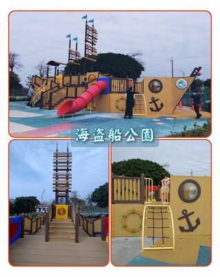 在海濱路旁有座海盜船公園,這是共融式的遊戲場,外觀以一艘海盜船為主體,設有溜滑梯、攀爬網、水管涵洞等...