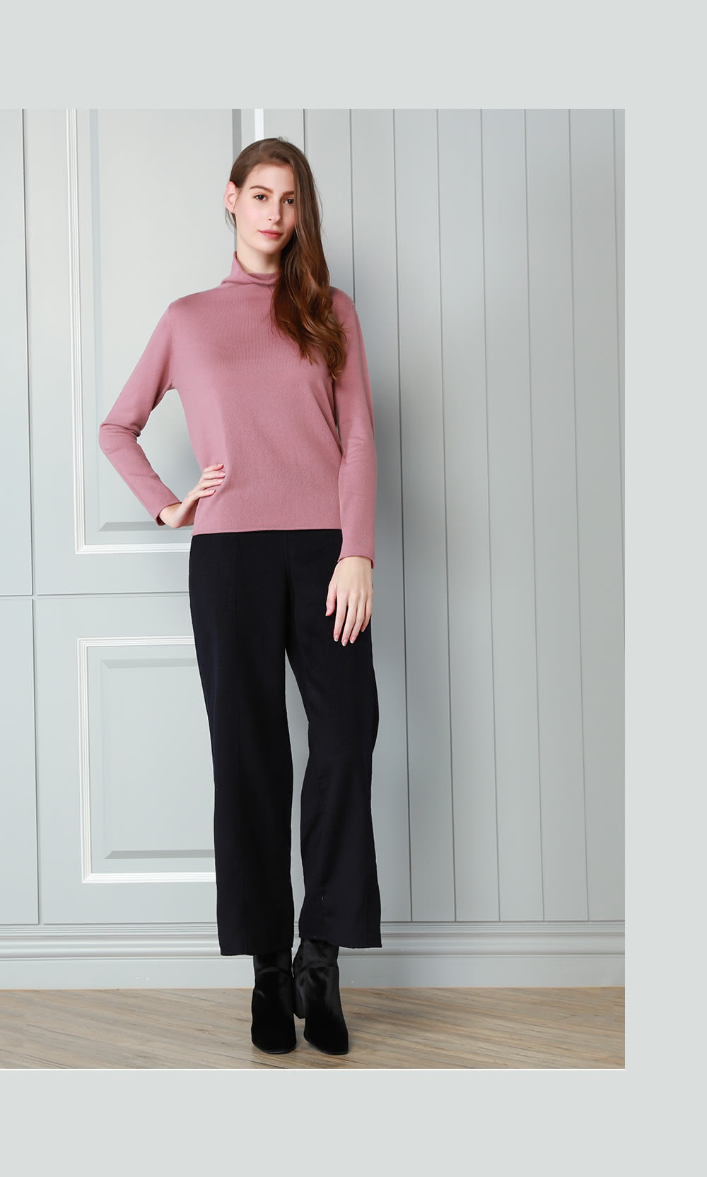 ▲ 矜蘭妃-100%喀什米爾捲邊鬆高領羊絨衫 的實物拍攝