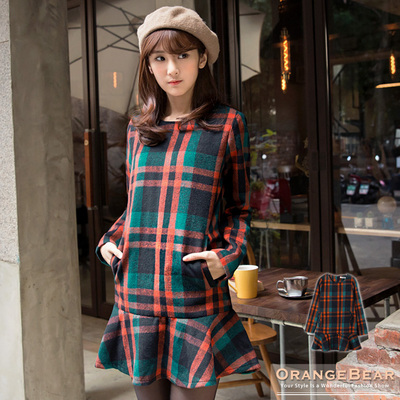 服裝推薦OB嚴選-經典品味~格紋雙口袋剪接圓傘襬長版上衣.2色