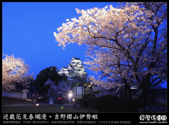 姬路的日文意指蠶繭,且所處的姬山與鷺山的兩座山崗酷似蠶繭故方圓一帶被人們稱為姬路;加上它白色城牆及蜿蜒屋簷造型猶如展翅欲飛的白鷺而有白鷺城之稱,講到姬路城它的來頭可不小,為什麼要來這裡實在有說不完得理由:姬路城與彥根、犬山、松本城並列全日本的『國寶四城』 聯合國登錄的世界文化遺產之一 與九州熊本城、大阪大阪城並列日本三大名城,重點又是百選的櫻花名所之一,並且有賞夜櫻的活動,重點是無料歐,晚上打光的姬路城說真的更加美麗夢幻了,加上又有音樂演奏表演真是感覺超夢幻的,還可以使用三腳架拍照,平常進城還要收費日幣六百勒﹦﹦賞櫻的時候居然還有這種好康,身為花見客的偶當然也要給它來拜訪一下!