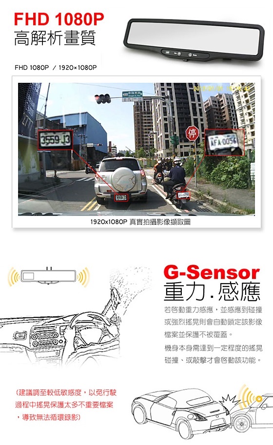 ◎支援G-sensor功能,可自動鎖定事故畫面