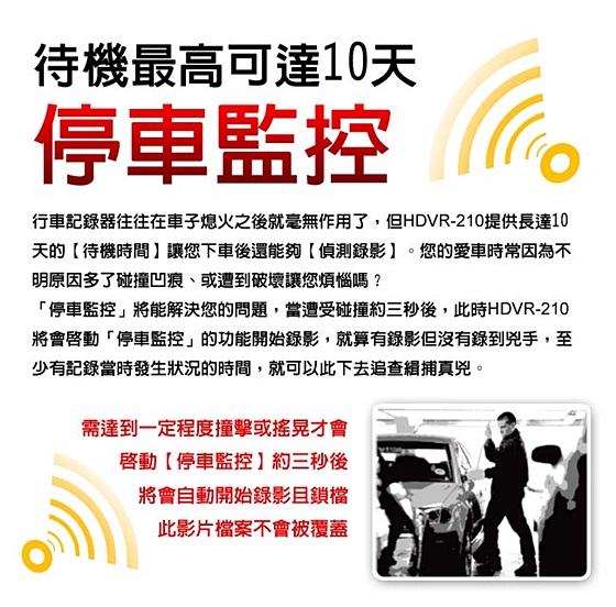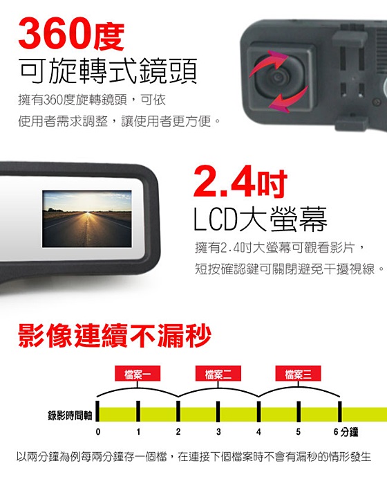 ●影像連續不漏秒,360度可選轉式鏡頭,待機高達10天停車監控