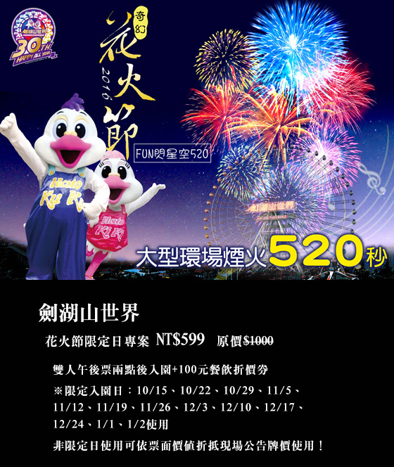 只要599元(雙人價)即可享有【劍湖山世界】原價1,000元花火節限定日專案:雙人午後票兩點後入園+100元餐飲折價券。限定入園日:10/15、10/22、10/29、11/5、11/12、11/19、11/26、12/3、12/10、12/17、12/24、1/1、1/2使用。非限定日使用可依票面價值折抵現場公告牌價使用!