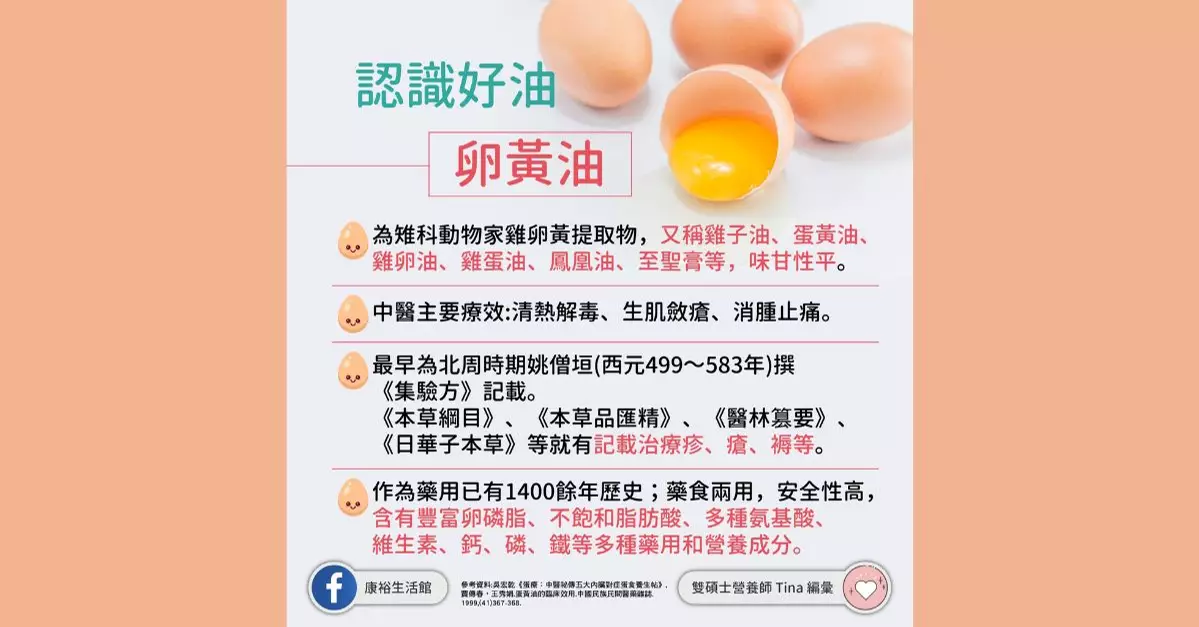 卵黃油因其特有的營養價值和生理機能,近幾年來引起國內外醫學、營養和食品工業普遍重視。目前臨床用於燒燙傷及瘡毒較為廣泛。卵黃油作為一種安全有效、藥食兩用物質,期許未來有更多藥品與保健品研究與開發。