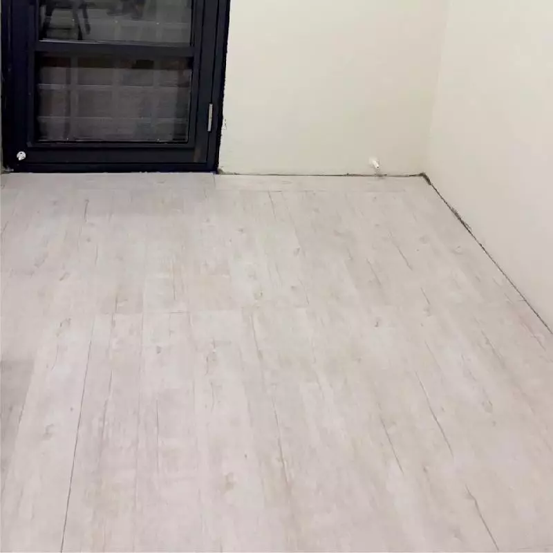 因為家裡本來傢俱跟雜物就不算多,一下子就把空間清空好準備開始鋪設!當初選用90s免膠地板的原因,除了質感很好之外,另一個關鍵原因就是他們家的網站做的非常完善,像裡面就有直接放地板的DIY教學,準備好美工刀、角尺,直接看著做就可以,原本還有點擔心會不會自己鋪,不小心切歪、裁切處凹凸不平…結果竟然!輕輕劃兩刀,再從兩邊往下折就能平整的分成兩片了。