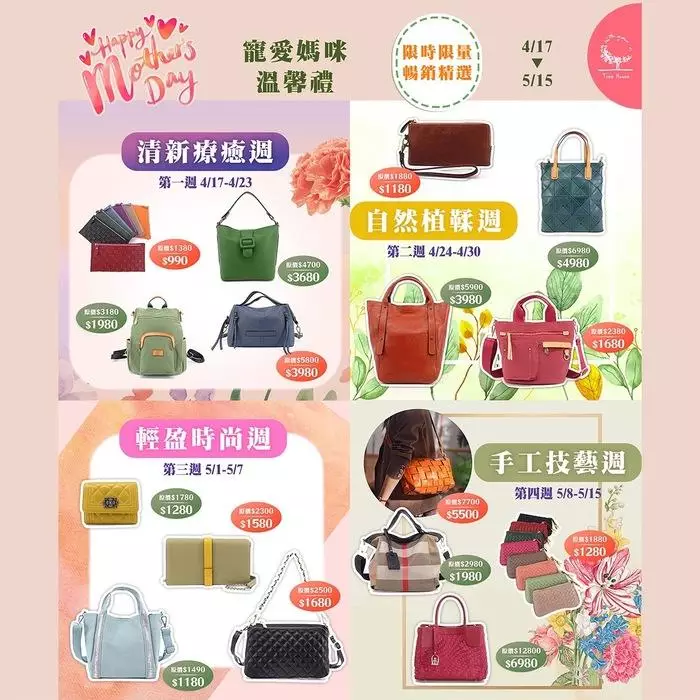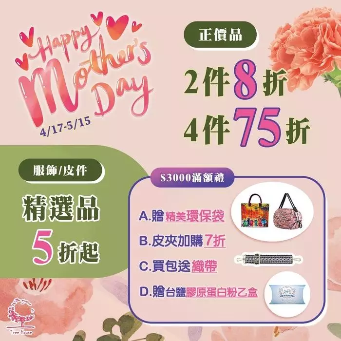 隨著母親節的腳步逐漸逼近,『Tree House』為了讓每一位超級媽咪都能感受到被愛的溫暖,特別推出了一系列的優惠活動和精選禮物,從2024年4月17日到2024年5月15日,不論是為媽咪挑選服飾、皮件還是滿額購物的好時機,讓我們一起來看看這次的精彩活動!
