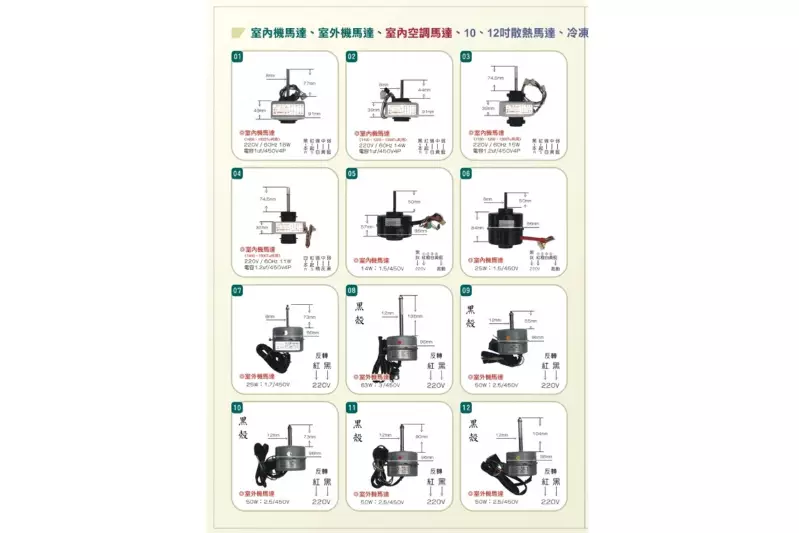 - 各類冷氣馬達:室內機、室外機、送風機等。